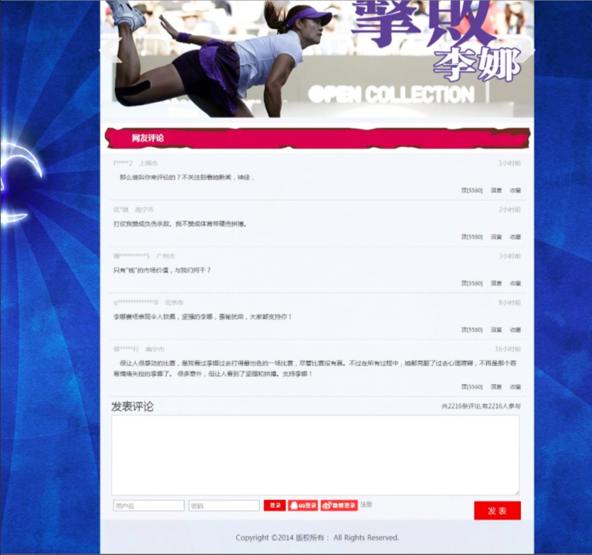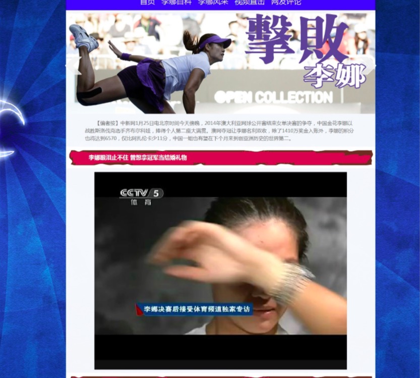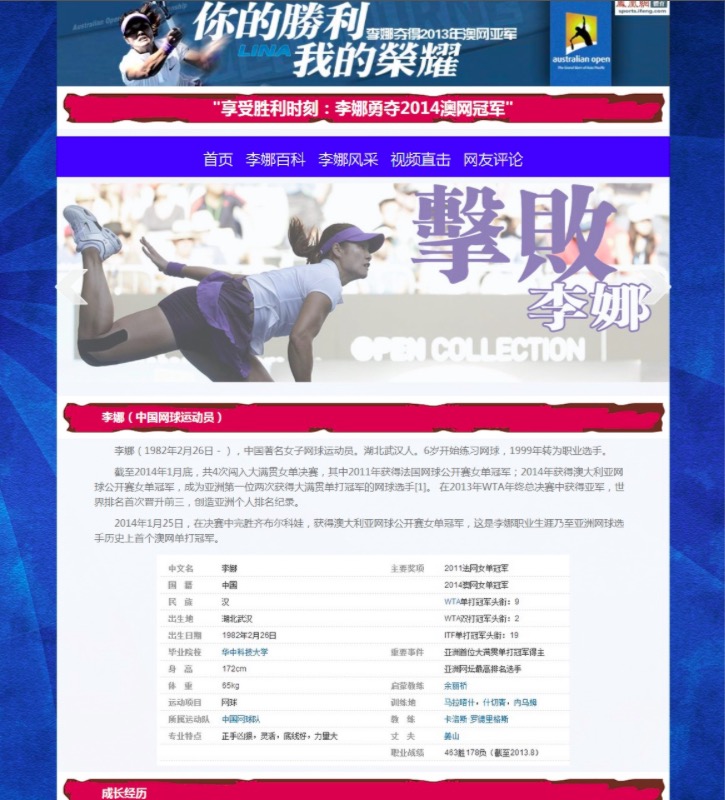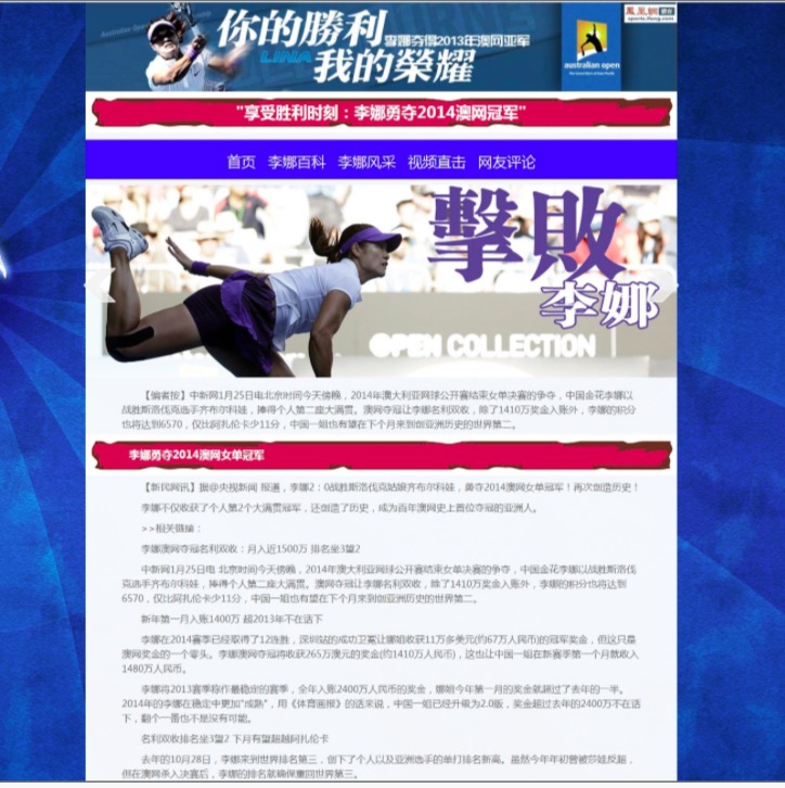 (40元)李娜勇夺2014澳网冠军 新闻专题5页面带轮播带评论带视频